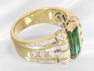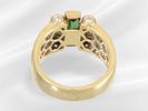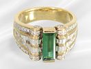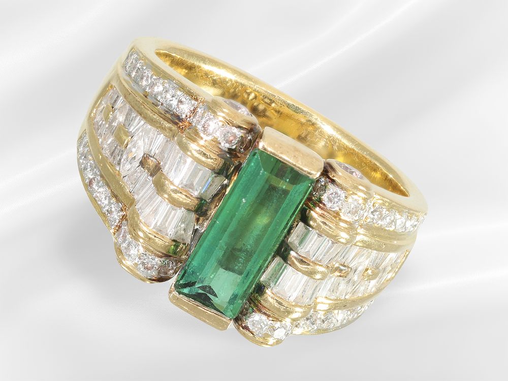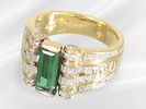 Ring: solid, richly set diamond/tourmaline goldsmith's ring, 18K gold: Approx. Ø18.5mm, ring size 58, approx. 13.7g, 18K gold, graduated worked, face approx. 13.5mm wide, set with a tourmaline in a baguette cut approx. 10.92 x 4.58 mm, the ring head is also set with numerous diamonds and brilliant-cut diamonds on the face and sides, the back is pierced, solid, decorative vintage handcrafted piece.