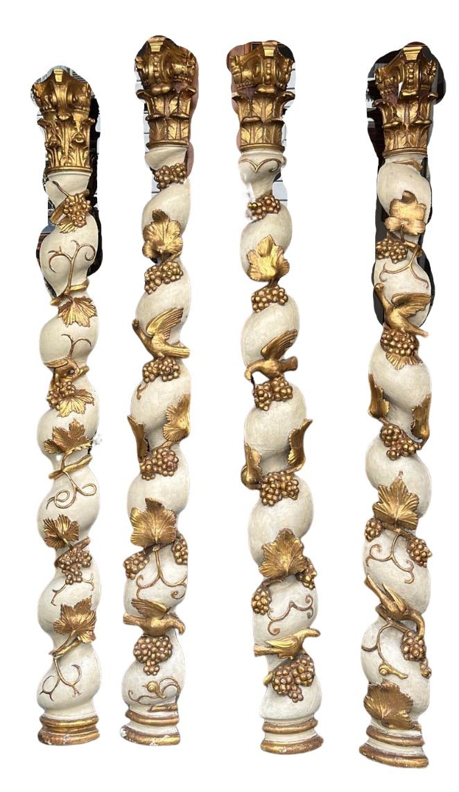 Lotto di colonne tortili in legno riccamente intagliate, dorate e laccate, decorate con figure in rilievo, cm